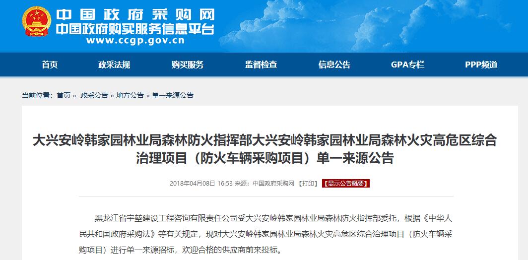 據(jù)林業(yè)局領(lǐng)導(dǎo)介紹,該批車輛到達(dá)林業(yè)局后下發(fā)至林業(yè)局防火辦,主要用于森林滅火人員物資輸送,后勤保障救援,防火器材運(yùn)輸?shù)戎饕ぷ,因此?duì)車輛的質(zhì)量要求極其嚴(yán)格,對(duì)我們公司提供的防火車輛給出高度評(píng)價(jià),此批車輛為韓家園林業(yè)局經(jīng)過層層篩選,反復(fù)招投標(biāo)后才確定的車型,公司接到中標(biāo)通知書時(shí)也是很激動(dòng),能接上這樣的森林防火設(shè)備運(yùn)輸車,也對(duì)我們的服務(wù),質(zhì)量提出更高的要求。該局領(lǐng)導(dǎo)介紹由于林區(qū)防火公路多為簡易道路,對(duì)車輛通過性要求很高,我公司提供的四驅(qū)越野卡車能夠滿足他們的需求。下圖為招標(biāo)公示。