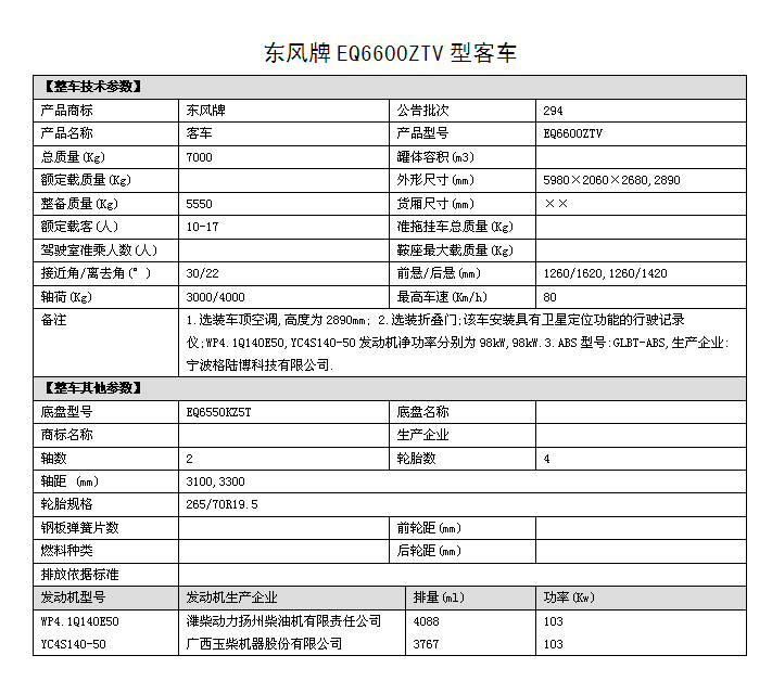 EQ6600ZTV四驅(qū)越野客車圖片,國五排放四驅(qū)10座越野客車價格,6米四驅(qū)客車多少錢,東風四驅(qū)越野客車參數(shù)配置: 1.底盤型號EQ6550KZ5T,發(fā)動機型號:YC4S140 50 國五排放 2.整車外形尺寸長寬高:(5980×2060×2890)mm 驅(qū)動形式:4×4 東風分時四驅(qū) 3.離合助力,方向助力,斷氣剎,鼓式自動,駕駛區(qū)域空調(diào) 4.車橋為東風德納,輪胎為265/70R19.5型越野輪胎,ABS 5.工具箱,前置防裝杠,粘接式推拉玻璃,發(fā)動機底板防護 6.鋁花紋地板,中檔皮革座椅10個+1個折疊座椅,整車座椅安全帶,手動式外擺門,正副司機門,后置雙開門,東風原廠派恩頂置空調(diào) , 7.窗簾,滅火器兩個,備胎一個,獨立燃油暖風系統(tǒng)帶兩個雙面王出風口 8.其它為EQ6600ZTV型四驅(qū)越野客車標配。具體配置參數(shù)參照(附件一)。 成品合格證、全額上戶發(fā)票、隨車工具、隨車文件各一套。