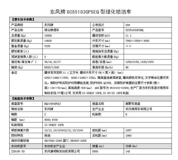 潤知星牌SCS5183GPSEQ四驅(qū)越野消防灑水車,東風(fēng)越野四驅(qū)森林消防供水車采用東風(fēng)D913新款駕駛室(可選裝老款153駕駛室),4*4驅(qū)動,ISB190 50國五發(fā)動機,4500mm/4700mm軸距,東風(fēng)六檔變速箱,10.00R20鋼絲胎,東風(fēng)商用車前后橋,罐體采用優(yōu)質(zhì)碳鋼QB235板材,罐體容積11.1立方,前沖后灑,側(cè)噴,后置工作平臺帶消防水炮,可選裝消防炮,消防泵等專用消防設(shè)備。主要用途:中國森林林業(yè)部門的森林消防滅火供水及利用車載消防泵消防炮進行遠程消滅森林火災(zāi)。