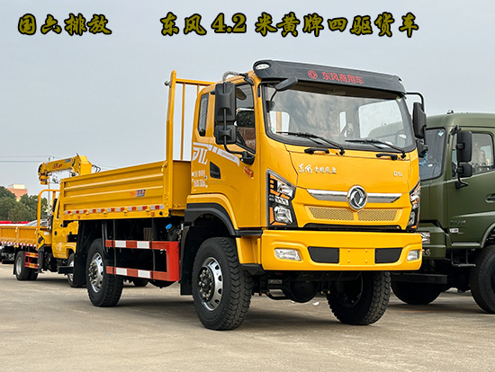 東風(fēng)黃牌4.2米原廠四驅(qū)貨車,DFV1101GP6D型四驅(qū)載貨汽車,該車驅(qū)動形式為4×4全輪驅(qū)動,采用東風(fēng)牌DFV5101TGP6DJ型特種作業(yè)底盤,采用東風(fēng)D1L一排半駕駛室?guī)г瓘S空調(diào),4×4驅(qū)動,選裝玉柴YCY30170-60和玉柴YCS04180-60發(fā)動機(jī),韶齒五檔變速箱,杭齒450分動箱帶高低擋,分時(shí)四驅(qū),軸距:3500mm,295/80R22.5越野輪胎,4T前橋,8T后橋,電動玻璃,方向助力,斷氣剎,帶ABS。車廂長4.2米,整車長6.05米,接近角33度,離去角17度,最小離地間隙35公分,涉水深度0.8米。