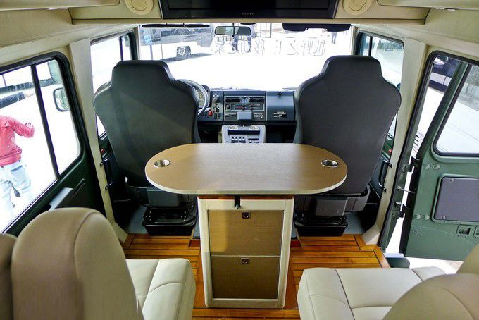 越野房車(chē)內(nèi)飾:可以看到,柚木地板外加兩個(gè)電動(dòng)座椅與一個(gè)帶儲(chǔ)藏柜的可移動(dòng)多功能桌構(gòu)成了這輛越野房車(chē)的第二排。除此之外,頭頂上方安置有26寸索尼液晶電視和帶衛(wèi)星電視機(jī)頂盒的藍(lán)光播放器,微波爐烤箱、小型冰箱、電磁爐等常用設(shè)備也是一應(yīng)俱全,當(dāng)然恒溫式的出水系統(tǒng)以及真空馬桶、獨(dú)立淋浴也是一樣不少。具備天窗和側(cè)窗的尾箱處安置有兩張舒適的標(biāo)準(zhǔn)床鋪,可以說(shuō)盡管這輛U5000并非加長(zhǎng)特裝版,但所有居住設(shè)備都很齊全。
