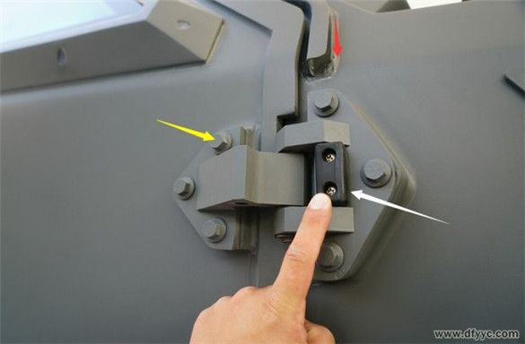 外拉手由上向下旋轉開啟,并采用一字鎖鑰匙鎖閉。紅色箭頭所指的是固定車門鎖具的螺栓。