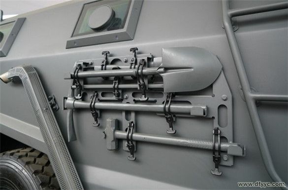 上圖是東風四驅防雷反恐戰(zhàn)車右前側圍懸掛附加工具或補給品的懸掛特寫。用手較費勁的抻拉橡膠懸掛鎖具。備用工具通過橡膠掛具與背板固定在車身側面,背板拆卸后可以成為盤等工具。