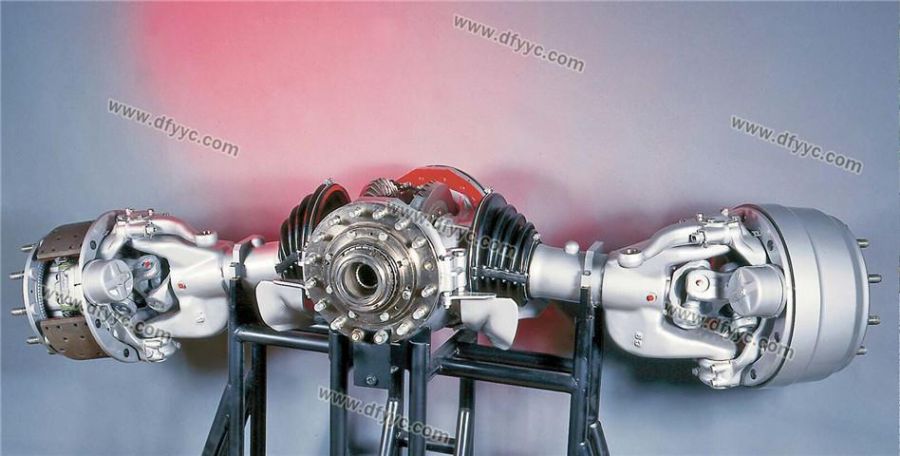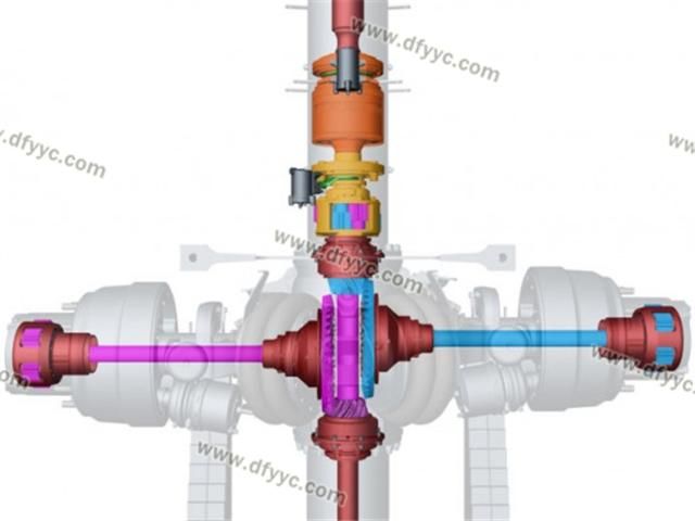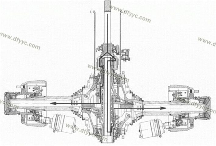 另外,這種斷開式車橋的輪間差速器并不在橋包中,而是被轉(zhuǎn)移到了脊柱套管了,左右側(cè)車輪分別由兩套錐齒輪驅(qū)動,為了讓這兩套錐齒輪互不干涉,其左右半軸在縱向錯開了一定的距離,也就是說它的兩個(gè)半軸并不在一個(gè)平面內(nèi)。類似的設(shè)計(jì)手法裝載機(jī)(4X4軸轉(zhuǎn)向的裝載機(jī))上也有使用,還有采用錯開一定角度的做法來避免左右錐齒輪互相干涉的情況。